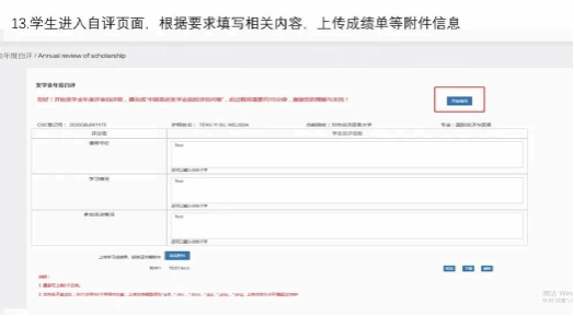 STEP 4:Enter the self-assessment page, fill in the required information, and upload supplementary materials (e.g. academic transcripts, award certificates). Please complete the "Chinese Government Scholarship Institution Evaluation Questionnaire" before the review.